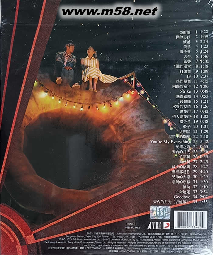 A Jay Chou FILM OST 01. 美術(shù)館 1’22” 02. 保齡男孩 1’09” 03. 波爺 2’14” 04. 美景1’23” 05. 浪子膏 1’24” 06. 天臺(tái)1’46" 07. 氣勢(shì) 1’10” 08. 龍門(mén)澡堂 1’18” 09. 打架舞 1’09” 10. IF 2’37” 11. 快門(mén)慢舞 4’15” 12. 阿郎的童年 1’06” 13. Strike 0’48” 14. 熱血碼頭 0’53” 15. 錢(qián)難賺 1’21” 16. 水管的友情 1’26” 17. 逛夜市 0’42” 18. 情人湖夜市 1’02” 19. 撈金魚(yú) 0’48” 20. 骰子 1’01” 21. 大明星 1’29” 22. 屋頂上的愿望 2’18” 23. You're My Everything 5’42” 24. 英雄之歌 0’55” 25. 天臺(tái)的月光 2’36” 26. 竹竿舞 0’55” 27. 狗仔舞 2’45” 28. 威少的陷阱 1’47” 29. 哪里都是你 4’40” 30. 兄弟的安慰 1’29” 31. 悲劇的序幕 1”30” 32. 無(wú)助 1’10” 33. 亡命追逐 3’54” 34. Goodbye 2’07” 35. 天臺(tái)的月光(吉他版) 1’55” 打架舞 詞:黃俊郎 曲:周杰倫 編曲:黃雨勛 想跟我干架 沒(méi)打聽(tīng)好嗎 我的拳頭可是毫無(wú)牽掛 拉筋一字馬 腳踩雙八卦 再送你電影里的如來(lái)神掌 這首歌是最能代表《天臺(tái)》「歌武片」概念的創(chuàng)作!對(duì)周杰倫及整個(gè)電影團(tuán)隊(duì)都是一個(gè)很特別的挑戰(zhàn)。顛覆大多數(shù)武打場(chǎng)面的嚴(yán)肅,改以周杰倫喜愛(ài)的風(fēng)趣元素,以交響管樂(lè)演奏出探戈曲風(fēng),要讓每一個(gè)招式都準(zhǔn)確的和音樂(lè)結(jié)合。但這也考驗(yàn)了國(guó)際級(jí)的武術(shù)指導(dǎo)梁吉泳,他不僅要設(shè)計(jì)到位的拳招及武術(shù)動(dòng)作,重要的是還得和音樂(lè)結(jié)合!梁吉泳說(shuō):「以往都是配樂(lè)配動(dòng)作,現(xiàn)在反過(guò)來(lái)我得聽(tīng)音樂(lè)設(shè)計(jì)動(dòng)作!不容易,但這是非常特別有趣的經(jīng)驗(yàn),厲害!」探戈的節(jié)奏牽動(dòng)每一個(gè)動(dòng)作,同時(shí)享受舞蹈和武打! 波爺 1’26” 詞:方文山 曲:周杰倫 編曲:黃雨勛 本草綱目有記載 天天天山的雪蓮很雪白 我波爺?shù)恼信普l(shuí)敢不拜 如果你很High就拿錢(qián)錢(qián)來(lái)買(mǎi)買(mǎi) Show Time! 一聲鑼響歡天喜地!從耳朵到眼睛,為之一亮!使用東方樂(lè)器如太鼓、二胡,結(jié)合嘻哈感十足的混音節(jié)奏,創(chuàng)作出J式風(fēng)格的東方嘻哈。曾志偉飾演的波爺喜氣十足,創(chuàng)新的輪椅舞加上身著改良旗袍超級(jí)吸睛的藥館美女,周杰倫奇想還原現(xiàn)代電視購(gòu)物原貌:可能就是這樣無(wú)誤。既做生意也做秀!新奇有趣,節(jié)奏感十足,讓人忍不住舞動(dòng)每一個(gè)關(guān)節(jié)。 天臺(tái) 詞:黃俊郎 曲:周杰倫 編曲:黃雨勛 我的愛(ài)永遠(yuǎn)不窮 多笑就不覺(jué)得痛 這里更靠近蔚藍(lán)的天空 這是一首,越聽(tīng)越快樂(lè)的歌。 從簡(jiǎn)單的長(zhǎng)笛開(kāi)展,到越來(lái)越豐滿的大合奏。周杰倫從簡(jiǎn)單到豐富,花不到兩分鐘的時(shí)間,讓我們身歷其境進(jìn)入天臺(tái)生活的一切,一點(diǎn)一滴分享了天臺(tái)生活的細(xì)節(jié)。這是天臺(tái)原聲帶所有音樂(lè)之中最接近音樂(lè)劇形式的創(chuàng)作。以交響樂(lè)的配置,使用大量的弦樂(lè),創(chuàng)造出如舞臺(tái)音樂(lè)劇般的華麗感!但同時(shí),簡(jiǎn)單的旋律、口白式的歌詞又令人朗朗上口。充份展現(xiàn)出天臺(tái)人的生活哲學(xué),自在、隨興,隨遇而安的快樂(lè),簡(jiǎn)單的很豐富!