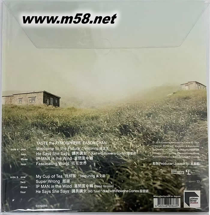 TASTE THE ATMOSPHERE 黑膠(m58.net) 《Stranger Under My Skin》收錄了五首粵語及一首英文歌曲。陳奕迅與監(jiān)制舒文首次合作,制作一張回歸心靈根本、較黑暗的唱片,與2010年推出的EP《Taste the Atmosphere》風(fēng)格形成強(qiáng)烈對比。舒文雇用了一個大型管弦樂團(tuán)作音樂配樂,整個樂團(tuán)由30多位頂尖樂手組成,并于廣州大型錄音室錄制背景音樂。 第十一屆華語音樂傳媒大獎-最佳粵語男歌手《Taste the Atmosphere》是香港歌手陳奕迅的粵語EP,于2010年10月15日發(fā)行。臺灣則于2010年10月22日發(fā)行 《Taste the Atmosphere》是繼陳奕迅于香港紅磡體育館舉辦DUO陳奕迅演唱會2010后推出的全新EP,收錄5首粵語及1首英文歌曲。在本專輯內(nèi),陳奕迅與多位非主流音樂人首次合作,包括專輯的監(jiān)制Joseph Ip(葉廣權(quán))、鬼才填詞人林敏驄,而他也是首次與歌手薩頂頂、露云娜、莫文蔚合唱歌曲,音樂類型大都與他以前的作品不同,本專輯可謂充滿實(shí)驗(yàn)性。