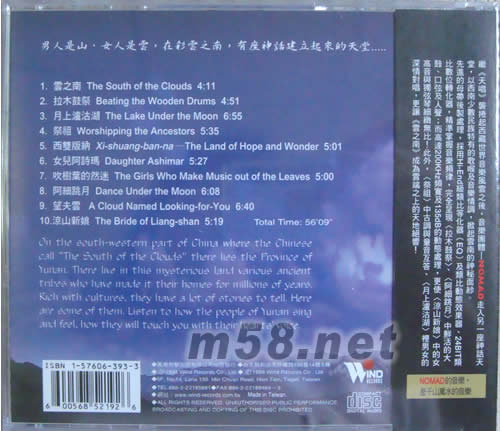 云之南(m58.net) 西南天際 穿云透霧而來的迷域原音 除了NOMAD 誰敢與天地對歌 繼《天唱》襲卷西藏世界音樂風云之后,音樂團體—NOMAD走入另一座神話天堂~云南,以西南少數民族特有的歌喉及音樂情調,掀起云南的神秘面紗。 先進的母帶后制處理,採用HI-END級類比等化器(EO)及類比動態效果器、24BIT類比數位轉化器,精準掌握音樂頻律,完全呈現(拉木鼓祭)中鮮活的磊鼓、品弦及人聲;而高達200KHZ頻寬及135DB的動態處理,更使(涼山新娘)中的女高音與獨弦琴細绖無比!此外,(祭祖)中古調與童音互答、(月上瀘沽湖)里男女的深情對唱,更讓(云之南)成為云端之上的天地絕響! 男人是山、女人是駢,在彩云之南,有座神話建立起來的天堂....