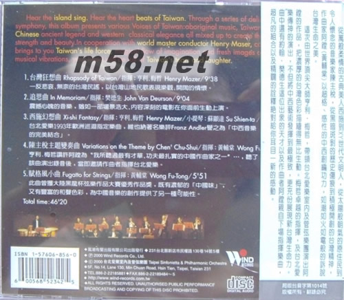 臺灣狂想曲RHAPSODY OF TAIWAN 管弦樂(m58.net) ★本專輯入圍2001年第十二屆金曲獎「最佳作曲人獎」及「最佳古典音樂專輯」★ 指揮:亨利 梅哲 這次曲中還有約翰.樊德生這位出眾的天才以及作曲者阿鏜親自下場指揮,從萬般柔情的古典美人西施到xy世代文明人;從太陽般朝氣的原住民到令人懷念的音樂家陳主稅;從黑暗斑剝的歷史傷痕到積極開創(chuàng)的臺灣精神......,超凡的組合以及精闢的詮釋,絕對讓你耳目一新,深受感動! 此輯由世界頂尖指揮大師享利.梅哲帶領(lǐng)臺北愛樂室內(nèi)及管弦樂團,演出本土作曲家阿鏜(黃輔鏜)的作品。梅哲卓越的指揮,阿鏜超格、感性的中西創(chuàng)編功力及國際知名提琴手--蘇顯達、臺北愛樂的傳神演出,如潮如火如電般地訴說臺灣生命之美,不但將中西藝術(shù)發(fā)揮到最極致,更充份展現(xiàn)新臺灣人的生命力。