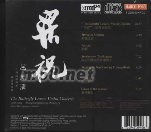 1.THE BUTTERFLY LOVERS VIOLIN CONCERTO 梁祝 小提琴協奏曲 2.SPRING IN XINJIANG 新疆之春 3.PASTORAL 牧歌 4.SUNSHINE ON TASHKURGAN 陽光照耀在塔什庫爾干 5.SINGING THE NIGHT AMONG FISHING -BOATS 魚舟唱晚 6.NOSTALGIA 思鄉曲 7.DANCE OF THE FRONTIER 塞外舞曲
