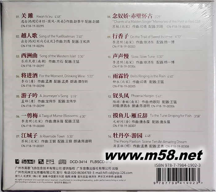 1. 關睢 (Crying Ospreys) 2. 越人歌 (Song of the Yue Boatman) 3. 西洲曲 (Song of the Western Islet) 4. 將進酒 (For the Moment, Drinking Wine) 5. 游子吟 (A Journeyer’s Song) 6. 一剪梅 (A Twig of Mume Blossoms) 7. 江城子 (A Riverside Town) 8. 念奴嬌 (Charm of a Maiden Singer) 9. 行香子 (On the Trail of Sweet Incense) 10. 聲聲慢 (Slow, Slow Tune) 11. 雨霖鈴 (Bells Ringing in the Rain) 12. 釵頭鳳 (Phoenix Hairpin) 13. 摸魚兒 (Groping for Fish) 14. 牡丹亭 (The Peony Pavilion)