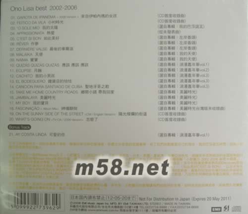 ONO LISA BEST 2002-2006 新歌+精選(m58.net) 尋找最美的回憶,留住最好的時光! 拂開春夏交替的微熱,最舒服的一張作品。 忘不了的美麗時光,宛如浪漫嘉年華般,靜謐但鮮活映在腦海裡。 聆聽左岸香頌的低調奢華,給了我們放鬆寵愛自己的理由。 我的巴莎諾瓦時間,因為小野麗莎的音樂而悠然動人… 日本樂壇首屈一指的Bossa Nova女王.小野麗莎,出道近20年來,足跡行遍巴西、日本、美國、夏威夷、臺灣亞洲各地,唱遍眾多耳熟能詳的各國經典曲目,成為引領起臺灣Bossa Nova風潮的先驅。繼《1997-2001日本醇選輯》后,小野麗莎推出了睽違7年的全新精選輯《小野麗莎 2002-2006 新歌+精選》。收錄了自2001年發表的專輯《我的巴莎諾瓦》起,一直到2006年專輯《美麗時光》等多張作品裡膾炙人口的曲目。其中包括廣受樂迷熟悉的Discovery旅游生活頻道2006形象短片主題曲〈美麗時光Jambalaya〉、〈鄉間小路 帶我回家Take Me Home Country Roads〉、〈如此美好C’EST SI BON〉,以及未曾在臺發表過的〈來自伊帕內瑪的女孩GAROTA DE IPANEMA(2006 Version)〉、〈怎麼了WHAT’S GOING ON〉等6首新曲。最后特別加收臺灣2005左岸咖啡館廣告曲〈可愛的你AY COSITA LINDA〉一共長達21首的豐富曲目。涵蓋了巴西Bossa Nova樂、美式經典、法式香頌,乃至於非洲傳統曲等廣泛樂風。悠悠道盡小野麗莎多年來的動人音樂之旅。 只要打開音響,流洩而出的輕柔旋律,總是能撫慰每顆疲憊的心靈。多年來,小野麗莎的歌聲讓我們知道好的音樂,如同美酒般愈陳愈香,經典歷久而彌新。一張細數美麗的音樂時光作品,邀您一起來品嘗幸福的滋味…。 ◎ 收錄選自《我的芭莎諾瓦》、《左岸香頌》、《我的天使》、《浪漫嘉年華vol.1~vol.3》、《美麗時光》等暢銷專輯代表作品,以及6首未曾在臺發表過的新曲,臺灣盤更獨家收錄Bonus Track—左岸咖啡館2005主題曲〈可愛的你〉,一共21首曲目。在紀念小野麗莎出道20周年之際,特地為歌迷獻上今年矚目度最高、最真材實料的新歌+精選輯??! ◎ 精美外紙盒包裝 ◎ 內附中文歌詞+樂曲解說