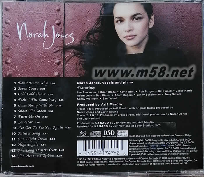 COME AWAY WITH ME SACD(m58.net) NORAH JONES的第一張個人專輯《Come Away With Me(遠走高飛)》中,Norah展現出精湛的琴藝與迷人的嗓音,并邀請眾多中生代杰出音樂人,包括:吉他手Bill Frisell、鼓手Brian Blade與貝斯手Lee Alexander擔任伴奏。專輯同名曲“Come Away With Me”為四重奏編制的抒情慢板歌曲,Norah溫熟的嗓音表現頗有大將之風......
