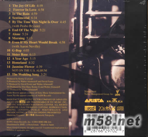 1、THE JOY OF LIFE 2、FOREVER IN LOVE 3、IN THE RAIN 4、SENTIMENTAL 5、BY THE TIME THIS NIGHT IS OVER 6、END OF THE NIGHT 7、ALONE 8、MORNING 9、EVEN IF MY HEART WOULD BREAK (WITH AARON NEVILLE) 10、G-BOP 11、SISTER ROSE 12、A YEAR AGO 13、HOMELAND 14、JASMINE FLOWER 15、THE WEDDING SONG