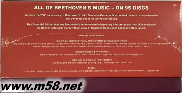The New Complete Essential Edition ALL OF BEETHOVEN S MUSIC - ON 95DISCS (95CD大套裝)(m58.net) 貝多芬250週年紀念套裝DG全集 (回歸限量版) (95 CD) 2020年為樂圣貝多芬誕生250週年的紀念大事,屆時全球古典樂壇無論在紀念音樂會上或是錄音發(fā)行上,相信會是多年來古典音樂界最大的慶?;顒樱蜻@位被譽為是史上最偉大的作曲家致敬。 這套貝多芬新版作品全集,是以2019年所集結成的120CD+3BD+2DVD套裝為依據(jù),做了濃縮改版。保留完整貝多芬作品錄音,并回歸DG的錄音系列。 95張CD分成八大類,收錄錄音史上重要的貝多芬曲目精彩錄音,從吉利爾斯、賈第納、阿瑪?shù)纤顾闹刈?、福特萬格勒、費雪迪斯考、肯普夫、卡拉揚、貝姆、曼紐因、慕特、普萊亞、波里尼等,超過250位著名貝多芬詮釋者錄音。有些曲目收錄有兩個版本以上,更有超過150分鐘為這套全集錄制的全新錄音,另外還有世界首度錄音版本也一併收錄在內。 精裝盒裝中詳盡原文解說冊,改以平裝版編排,深入淺出的引言。將作品順序採字母編排,易于搜尋。同時這個發(fā)行也是限量發(fā)售,非常值得珍藏。
