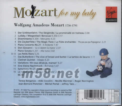1. Der Sclittenfahrt / The Sleighride / La promenade en traineau 2. Lullaby / Wiegenlied / Berceuse 3. Divertimento - Menuetto 4. Die Zauberflöte / The Magic Flute / La Flute enchantee (Pa-pa-pa-pa-Papageno) 5. Piano Concerto No.21 - II Andante 6. Don Giavanni / La ci darem la mano 7. Piano Sonata / Alla Turca 8. Les Petits Riens 11. Das Butterbrot / The Slice of bread and butter / La tartine de beurre 12. Clarinet Quintet - Adagio 13. Variations Ah vous dirais-je maman 14. Eine kleine Nachtmusik - Romanze 15. Symphony No.25 - I Allaegro 16. Le nozze di Figaro / Voi che sepete