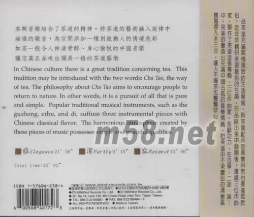茶道(m58.net) 幽雅·深凈·自然 充滿東方韻味的茶道音樂 品茶是充滿閑情逸致的生活藝術,與茶道配合的音樂自然也要高雅脫俗。近年來精研茶道藝術的任韻,在品味出茶中馀韻后,邀請三位作曲家,制作了茶道這張專輯。三位作曲家,名顯功力,在古箏、二胡、笛…中,完美的營造出充滿中國古風的音樂情緒,把茶道中不染塵俗的清雅氣質寫得入木三分,讓人不喝茶也飄飄欲仙。 本輯音樂結合了茶道的精神,將茶道的藝術融入旋律中幽雅的樂音,為空間添加一種別致動人的情境色彩如茶一般令人神清骨醉、身心愉悅的中國音樂讓您真正品味出獨具一格的茶道藝術