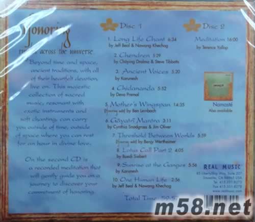 Honoring 光明真言 新世紀純音樂(m58.net) 雙CD收錄多位心靈音樂大師所創作之冥想作品,對于作瑜珈練習及冥想沉思,有一定之成效及作用,舒緩的旋律令聽眾忘卻一切煩憂。DISC 2 收錄一段長達16分鐘之冥想領導師,帶領聽眾體驗一個難忘的冥想之旅。