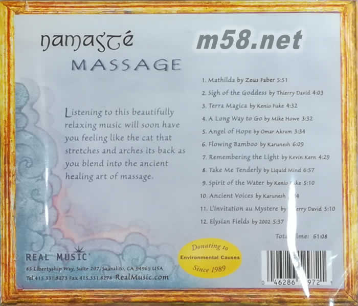 Namaste Massage 按摩治療音樂專輯 新世紀純音樂(m58.net) 一張精彩極富實用價值的按摩治療音樂專輯,收錄12首由當代最出色的心靈音樂,讓聽眾透過這些音樂進行按摩、瑜伽及冥想活動時,洗滌心靈,將一切煩瑣暫時拋開,是作為按摩治療音樂專輯的絕佳選擇。