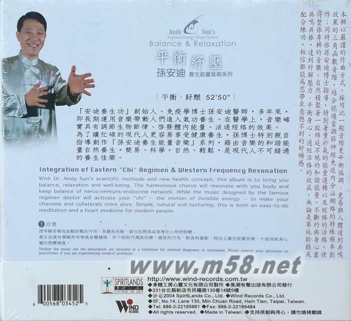 本輯以嚴謹的作曲方式,采用比一般音階更平衡協調,更易與人體達到共鳴效果的三角函數音階,結合能適當調節神經免疫分泌網絡的特殊頻率創作;同時依孫安迪博士指導,特別著重于氣的能量運轉以及經絡的活絡,使得整張專輯的音樂,自然積聚著一股綿延不絕的和諧能量,不斷的與身心靈共鳴共振,達到舒解壓力、平衡身心、通經活絡的效益,無論是單純聆聽或配合練功,相信都能為您帶來意想不到的舒暢感。
