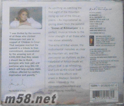 Snows of Kilimanjaro 乞力馬扎羅的雪(m58.net) As uplifting as catching the first sight of the mountain rising up out of the African plains; as inspirational as gazing down from the summit - "Snows of Kilimanjaro" is a perfect, musical tribute to the inner strength of all those who rise above adversity. The echo of tribal voices, the instrumental melodies as clear as mountain air, and the percussion as rhythmic as the heartbeat of Africa creates an album that is as refreshing, and pure as the snow itself. Listen to the album and share in Medwyn Goodall's vision inspired by the climbers' achievement and this amazing mountain.
