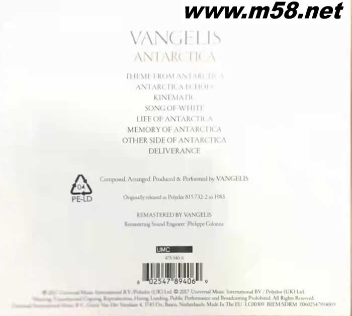 價格為估,以實到貨為準! 南極物語 2016版 ANTARCTICA REMASTERED BY VANGILIS(m58.net) ★日本新浪潮派導演藏原惟繕1983年執導【南極物語】電影原聲帶,日本奧斯卡獎“最佳電影配樂”提名 ★當時只在日本當地發行,直至1988年才得以在其他地區發行,2016全新數位化錄製版本由Vangelis本人親自操刀 這張CD也可算得上是一張極品名碟。故事講的是一個日本科學家去南極考察,歷盡艱險,成功后不得不把拉雪橇的狗留下,接著就是狗在冰天雪地為了生存而奮斗的故事。此片音域寬闊,高音區極為透明,備受美國TAS的推崇。 此碟是電子琴大師Vangelis的代表作,所表現的浩瀚氣魄與大自然景象可說是前無古人,錄音水平也非一般,結象力與空氣感都是電子樂中的極品。其中很多段落被經常用作一些電視節目的片頭曲或背景音樂。大家應該很熟悉! 美國TAS天書上榜天碟·香港CD圣經發燒級名盤 最佳電影配樂 不朽大師經典作 范吉利斯(Vangelis)---希臘著名音樂家,他的音樂風格集電子、新世紀、古典于一體。他曾因為電影《火戰車》(Chariots Of Fire)、《銀翼殺手》(Blade Runner)、《1492:征服天堂》(1492: Conquest of Paradise)、《南極物語》等制作電影配樂而成名。《火之戰車》配樂贏得了奧斯卡“最佳電影歌曲”獎。
