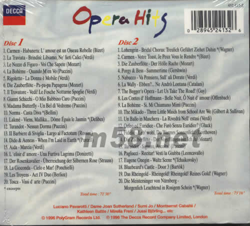 01 Bizet-- Carmen -- Habanera- L'amour Est Un Oiseau Rebelle (Sir Georg Solti, London Philharmonic Orchestra) 02 Verdi-- La Traviata -- Brindisi- Libiamo, Ne'lieti Calici (Richard Bonynge, National Philharmonic Orchestra) 03 Mozart-- Le Nozze Di Figaro -- Voi Che Sapete (Sir John Pritchard, London Symphony Orchestra) 04 Puccini-- La Bohème -- Quando M'en Vo (Rolando Panerai, Herbert Von Karajan Berlin Philharmonic) 05 Verdi-- Rigoletto -- La Donna è Mobile (Richard Bonynge, London Symphony Orchestra) 06 Mozart-- Die Zauberfl?te -- Pa-Pa-Pa Papagena (Sir Georg Solti, Wiener Philharmoniker) 07 Verdi-- Il Trovatore -- Vedi! Le Fosche Notturne Spoglie (Albert Erede, Coro Del Maggio Musicale Fiorentino Orchestre 08 Puccini-- Gianni Schicchi -- O Mio Babbino Caro (Lamberto Gardelli, Orchestra Del Maggio Musicale Fiorentino) 09 Puccini-- Madama Butterfly -- Un Bel Dì Vedremo (Herbert Von Karajan, Wiener Philharmoniker) 10 Bellini-- Norma -- Casta Diva (Richard Bonynge, London Symphony Orchestra And Chorus) 11 Delibes-- Lakmé -- Viens, Mallika...D?me épais Le Jasmin (Richard Bonynge, L'orchestre National De L'opera De Monte-Carlo) 12 Puccini-- Turandot -- Nessun Dorma (Zubin Mehta, London Philharmonic Orchestra) 13 Rossini-- Il Barbiere Di Siviglia -- Largo Al Factotum (Silvio Varviso, London Philharmonic Orchestra) 14 Purcell-- Dido & Aeneas -- When I'm Laid In Earth (Anthony Lewis, English Chamber Orchestra) 15 Verdi-- Aida -- Marcia (Herbert Von Karajan, Wiener Philharmoniker) 16 Donizetti-- L'elisir D'amore -- Una Furtiva Lagrima (Giuseppe Di Stefano, Francesco Molinari-Pradelli Orchestra 17 Strauss-- Der Rosenkavalier -- überreichung Der Silbernen Rose (Erich Kleiber, Wiener Philharmoniker) 18 Ponchielli-- La Gioconda -- Cielo E Mar! (Alberto Erede, Orchestra Of Maggio Musicale, Fiorentino) 19 Berlioz-- Les Troyens -- Duo (Charles Dutoit, Orchestra Symphonique De Montréal) 20 Puccini-- Tosca -- Vissi D'arte (Act Ⅳ, Francesco Molinari-Pradelli Orchestra Dell' Accademia Di Santa Cecilia, Roma) 01 Wagner-- Lohengrin -- Bridal Chorus- Treulich Gefhrt Ziehet Dahin (Konzertvereinigung Wiener Staatsopernchor, Sir Georg So 02 Bizet-- Carmen -- Votre Toast, Je Peux Vous Le Rendre (Sir Georg Solti, London Philharmonic Orchestra) 03 Mozart-- Die Zauberfl?te -- Der Hlle Rache (Sir Georg Solti, Wiener Philharmoniker) 04 Gershwin-- Porgy & Bess -- Summertime 05 Verdi-- Nabucco -- Va Pensiero, Sull' Ali Dorate (Chorus Of Vienna State Opera, Lanberto Gardella, Vienna Opera Ochestra) 06 Catalani-- La Wally -- Ebben-...Ne Andro Lontana (Fausto Cleva, L'orchestra National De L'Opéra De Monte-Carlo) 07 Gay-- The Beggar's Opera -- Let Us Take The Road! (Richard Bonynge, National Philharmonic Orchestra) 08 Offenbach-- Les Contes D'Hoffmann -- Belle Nuit, O Nuit D'amour (Richard Bonynge, Orchestre De La Suisse Romande) 09 Puccini-- La Bohème -- Si, Mi Chiamano Mimì (Herbert Von Karajan, Berliner Philharmoniker) 10 Sullivan-- The Mikado -- Three Little Maids From School Are We (Royston Nash, Royal Philharmonic Orchestra) 11 Verdi-- Un Ballo In Maschera -- La Rivedrà Nell' Estasi (Sir Georg Solti, National Philharmonic Orchestra) 12 Gluck-- Orfeo Ed Euridice -- Che Faro Senza Euridice- (Sir Georg Solti, Orchestra Of The Royal Opera House 13 Beethoven-- Fidelio -- Leb' Wohl, Du Warmes Sonnenlicht (Sir Georg Solti, Chicago Symphony Orchestra) 14 Mozart-- Die Zauberfl?te -- Der Vogelf?nger Bin Ich Ja (Sir Georg Solti, Wiener Philharmoniker) 15 Puccini-- Turandot -- Signore, Ascolta! (Zubin Metha, London Philharmonic Orchestra) 16 Leoncavallo-- Pagliacci -- Recitar! Vesti La Giubba (Giuseppe Patan, National Philharmonic Orchestra) 17 Tchaikovsky-- Eugene Onegin -- Waltz Scene (Stuart Burrows, Orchestra Of The Royal Opera House, Convent Garden) 18 Bartok-- Bluebeard's Castle -- Door 3 (Istvn Kertsz, London Symphony Orchestra) 19 Wagner-- Das Rheingold -- Rheingold! Rheingold! Reines Gold! (Sir Georg Solti, Wiener Philharmoniker) 20 Wagner-- Die Meistersinger Von Nürnberg -- Morgenlich Leuchtend In Rosigem Schein (Sir Georg Solti, Wiener Philharmoniker)