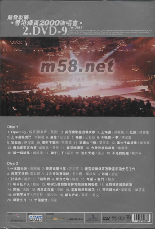 價(jià)格為估,以實(shí)到貨為準(zhǔn)! 龍發(fā)制藥 香港輝黃2000演唱會(huì)(m58.net) 香港輝黃2000演唱會(huì) 全長(zhǎng)三小時(shí)多角度 演唱會(huì)版及卡拉OK版DVD 環(huán)迴立體聲AC-3(5.1)