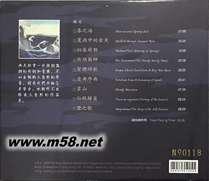 1.春之海Haru no umi(Spring Sea) 7:00 2.夏雨中的金魚 Goldfish through Summer Rain 5:05 3.初春萌動Hoshun(First Stirrings of Spring) 10:08 4.街頭樂師Der Leiermann(The Hurdy-Gurdy Man) 3:38 5.圣體頌歌Corpus Christi Carol from A Boy Was Born 3:35 6.慶典序曲Interlude from A Ceremony of Carols 3:41 7.云山 Cloudy Mountain 7:29 8.仙鶴歸巢Tsuru no sugomori(Nesting of the Cranes) 5:05 9. 蠶之歌 Mayudama(The Song of the Silk Cocoon) 8:29