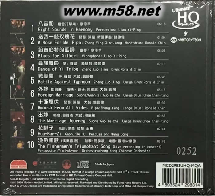 敲擊王 UHQCD+MQACD 使用玻璃CD技術(shù)壓制 限量頭版(m58.net) 敲擊王UHQCD試音天碟,MQA-24bit 176.4kHZ、高音通透、動態(tài)驚人,空氣感靚而寛闊,考驗音響器材的必備軟體。本碟精選了陣容鼎盛的中國大師,在不同時間的演奏錄音。首批限量珍藏版、附獨立編號。 ★ 打擊樂器的顛峰之作,教堂單點灌錄,定位清晰、殘響自然、力感磅礡,深度音場的震撼! ★ MQA 24bit 176.4kHz 編碼,玻璃 CD 技術(shù)精心壓制! ★ 寬廣動態(tài)和鮮活音色,發(fā)燒友系統(tǒng)測試必備天碟! 「現(xiàn)代音像」推出的《敲擊王》測試天碟,是此公司執(zhí)著於優(yōu)異錄音效果的又一驗證;本片由林錫堅監(jiān)製、黎承昌錄音,並於教堂中作單點灌錄,錄製地點包括香港西貢景輝堂、香港文化中心內(nèi),現(xiàn)場錄製,取樣率使用 1bit / 5.6MHz DSD,堂音殘響豐滿自然,鼓皮振動,豐張力感,鼓邊敲擊,鑑鏘力勁。打擊樂器名家錢國偉在此測試天碟中演奏多種敲擊樂器,與其他許多著名中樂演奏家聯(lián)手,陣容鼎盛,讓許多經(jīng)典旋律展現(xiàn)出精采無比的樂音,涵蓋古箏、琵琶等多樣化樂器,以打擊樂貫穿,展現(xiàn)出磅礡的萬千氣勢、帶來光芒四射的聆聽震撼! 本次的 UHQ+MQA 版本,使用玻璃 CD 技術(shù)壓製 UHQCD,以原 DSD 母帶進行 MQA 編碼,將 24bit 176.4kHz 編入 CD 格式內(nèi),適合所有 CD 機播放,樂迷只要配合 MQA 解碼,便能享受 24bit 高清檔的效果,其中高音通透、動態(tài)驚人,空氣感寛闊豐盈,呈現(xiàn)出極度鮮明的定位及密度表現(xiàn),例如〈戰(zhàn)颱風(fēng)〉及〈十面埋伏〉可明顯聽出大鼓在箏的后方,〈外嫁〉和〈出嫁〉更可聽出吹奏部門行進的方向正好相反,分別是從門外一直走向接近麥克風(fēng)、和從教堂中走出去。在多首樂曲中均能清楚地感受到樂器的位置以及移動方向,可以清楚地測試出音場深度及重塑教堂高度的表現(xiàn)!