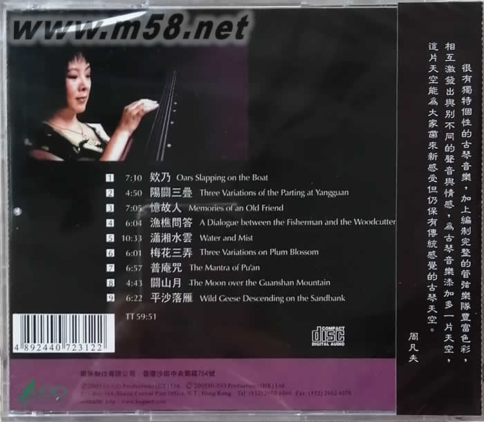 5 瀟湘水云 Water and mist 6 梅花三弄 Three variations on plum blossom 7 普庵咒 The mantra of puan 8 關山月 The moon over the guanshan mountain 9 平沙落雁 Wild geese descending on the sandbank