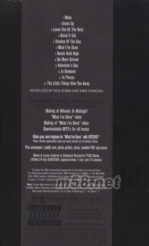 1.WAKE 2.GIVEN UP 3.LEAVE OUT ALL THE REST 4.BLEED IT OUT 5.SHADOW OF THE DAY 6.WHAT L'VE DONE 7.HANDS HELD HIGH 8.NO MORE SORROW 9.VALENTINE 'S DAY 10.IN BETWEEN 11.IN PIECES 12.THE LITTLE THINGS GIVE YOU AWAY MVI(MUSIC VIDEO INTERACTIVE) PLAYS IN AL DVD PLAYERS AND DVD DRIVES MAKING OF MINUTES TO MIDNIGHT WHAT L'VE DONE' VIDEO DOWNLOADABLE MP3'S FOR ALL TRACKS
