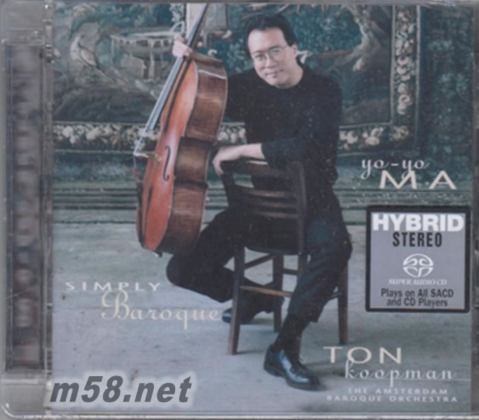 SIMPLY BAROQUE 繁花似錦巴洛克 SACD(m58.net) 馬友友在一九九三年接受荷蘭音樂會大會邀請,前往演出。馬友友在漫長的音樂生涯中一直在尋找各種靈感以增加他對大提琴演奏的認識,音樂會大會堂的邀請,讓馬友友興起了以古樂器探討大提琴的念頭。因為荷蘭正是近代古樂演奏的重鎮,於是他提議邀請傑出的古樂指揮家兼管風琴 家湯庫普曼率領他的阿姆斯特丹巴洛克古樂團與他合奏。結果於是造就了這張馬友友錄音生涯中獨一無二的專輯。為此,馬友友特別請英國著名的古樂製造家將他手中的史特拉第瓦里琴改回巴洛克琴的型式:琴弦間距拉大、琴馬變厚且將四弦拉在一個平面上、琴弦改成羊腸弦、弓也改成大弧度的古弓。而為此馬友友更煞費苦心的調整自己的演奏方式和風格,讓自己在本片中完全變成一個專門的古大提琴演奏家。 本片中馬友友演奏了兩套不同風格的樂曲:第一套是由庫普曼依巴哈作品所作的改編曲。庫普曼特別為馬友友改編了一些知名或少為人知的巴哈清唱劇作品,身為巴哈清唱劇全集錄音貢獻者之一,庫普最深知這些樂的睛妙之第,他的改編,不僅讓馬友友古大提琴演奏充滿迷人的美感,更讓人對巴哈這些優美的音樂有了新的體驗。片中庫普最選了一首包凱利尼最常為現代大提琴家演奏的協奏曲,這質是音樂學者葛魯茲將兩首包凱利尼協奏曲合成的作品。另一首則是極少為人演奏的作品,這也是從兩首包凱利尼協奏曲合成的曲子。庫普曼在此為馬友友寫了極為艱難的裝飾奏,馬友友的演奏讓他驚歎不可能! 1 第一部份:改編巴哈作品 2 第二部份:包凱利尼大提琴協奏曲