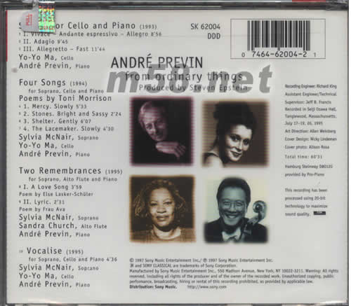 FOUR SONGS (1994) FOR SOPRANO,CELLO AND PIANO POEMS BY YONI MORRISON 1.MERCY.SLOWLY 2.STONES.BRIGHT AND SASSY 3.SHELTER.GENTLY 4.THE LACEMAKER.SLOWLY SYLVIA MCNAIR,SOPRANO YO-YO MA,CELLO ANDRE PRECIN,PIANO TWO REMEMBRANCES(1995) FOR SOPRANO,ALTO FLUTE AND PIANO 1.A LOVE SONG POEM BY ELSE LASKER-SCHULER 2.LYRIC POEM BY FRAU AVA SYLVIA MCNAIR,SOPRANO SANDRA CHURCH ,ALTO FLUTE ANDRE PREVIN,PIANO