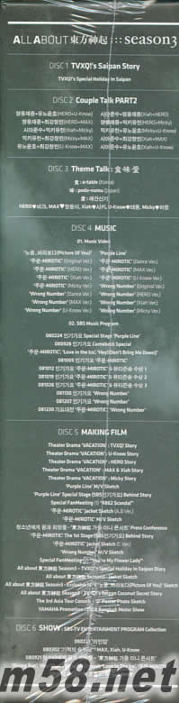 DISC1. [TVXQ!'s Saipan Story] - TVXQ!’s Special Holiday in Saipan DISC2. [Couple Talk PART2] - 영웅재중+유노윤호(HERO+U-Know) - 시아준수+영웅재중(Xiah+HERO) - 영웅재중+최강창민(HERO+MAX) - 영웅재중+믹키유천(HERO+Micky) - 시아준수+믹키유천(Xiah+Micky) - 믹키유천+유노윤호(Micky+U-Know) - 믹키유천+최강창민(Micky+MAX) - 시아준수+최강창민(Xiah+MAX) - 유노윤호+최강창민(U-Know+MAX) - 시아준수+유노윤호(Xiah+U-Know) DISC3. [Theme Talk : 食?味?愛 ] - 食 : e-table (Korea)? - 味 : podo-namu (Japan) - 愛 : 애견신기 [HERO♥비크 / MAX♥망둥이/ Xiah♥샤키/ U-Know♥태풍/ Micky♥하랑] DISC4. [MUSIC] 01. Music Video - ‘노을..바라보다(Picture Of You)’ - ‘Purple Line’ - ‘주문-MIROTIC’?(Original Ver.) - ‘주문-MIROTIC’ (Dance Ver.) - ‘주문-MIROTIC’ (HERO Ver.) - ‘주문-MIROTIC’ (MAX Ver.) - ‘주문-MIROTIC’ (Xiah Ver.) - ‘주문-MIROTIC’ (U-Know Ver.) - ‘주문-MIROTIC’ (Micky Ver.) - ‘Wrong Number’ (Original Ver.) - ‘Wrong Number’ (Dance Ver.) - ‘Wrong Number’ (HERO Ver.) - ‘Wrong Number’ (MAX Ver.) - ‘Wrong Number’ (Xiah Ver.) - ‘Wrong Number’ (U-Know Ver.) - ‘Wrong Number’ (Micky Ver.) 02. SBS Music Program - 080224 인기가요 Special Stage ‘Purple Line’ - 080928 인기가요 Comeback Special [‘주문-MIROTIC’, ‘Love in the Ice’, ‘Hey!(Don’t Bring Me Down)’] - 081005 인기가요 ‘주문-MIROTIC’? - 081012 인기가요 ‘주문-MIROTIC’&뮤티즌송 수상1? - 081019 인기가요 ‘주문-MIROTIC’&뮤티즌송 수상2 - 081026 인기가요 ‘주문-MIROTIC’&뮤티즌송 수상3 - 081130 인기가요 ‘Wrong Number’ - 081207 인기가요 ‘Wrong Number’ - 081230 가요대전 [‘주문-MIROTIC’, ‘Wrong Number’] DISC5. [MAKING FILM] - Theater Drama ‘VACATION’ : TVXQ! Story - Theater Drama ‘VACATION’: U-Know Story - Theater Drama ‘VACATION’: HERO Story - Theater Drama ‘VACATION’: MAX & Xiah Story - Theater Drama ‘VACATION’: Micky Story - ‘Purple Line’ M/V Sketch - ‘Purple Line’ Special Stage[SBS인기가요]Behind Story - Special FanMeeting (1) “4862 Scandal”? - ‘주문-MIROTIC’ Jacket Sketch (A,B Ver.) - ‘주문-MIROTIC’ M/V Sketch? - 청소년에게 꿈과 희망을 - ‘東方神起 가을 미니 콘서트’ Press Conference - ‘주문-MIROTIC’ The 1st Stage[SBS인기가요] Behind Story - ‘주문-MIROTIC’ Jacket Sketch (C Ver.) - ‘Wrong Number’ M/V Sketch - Special FanMeeting (2) “You`re My Flower Lady”? - All about 東方神起 Season3 ? TVXQ!’s Special Holiday In Saipan Diary - All about 東方神起 Season3 - Jacket Sketch - All about 東方神起 Season3 - Exclusive M/V ‘노을..바라보다(Picture Of You)’ Sketch - All about 東方神起 Season3 - TVXQ!’s Saipan Coconut Secret Story - The 3rd Asia Tour Concert - ‘O’ Poster Photo Sketch - YAMAHA Promotion: 2009 Bangkok Motor Show DISC6. [SHOW : SBS-TV ENTERTAINMENT PROGRAM Collection] - 080223 ‘라인업’ - 080302 ‘기적의 승부사’ - MAX, Xiah, U-Know - 080921 청소년에게 꿈과 희망을 ? ‘東方神起 가을 미니 콘서트’ [‘Rising Sun’, ‘Hey!(Don’t Bring Me Down)’,?‘Love In The Ice’, ‘주문-MIROTIC’] - 081002 ‘김정은의 초콜릿’ No Cut Story