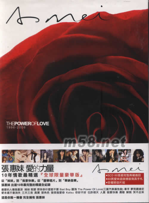愛的力量10年情歌最精選(5CD豪華限量版)(m58.net) 斷版 5CD 80首最完整典藏曲目 80頁愛妹語錄精裝寫真手札 珍藏明信片組 這是你唯一機會 完全擁有 張惠妹 有一種聲音,來自方寸心底 唱出即將遺失的純凈與美好 唱出來自淳真的本性與深刻的感情 有一種人,注定會大鳴大放 卻 要她在浮華滄海中 學習成長 或許艱辛,但 仍默默保有她的單純與勇敢 就是她 張惠妹 10年了 A Mei一直用她的歌聲 傳遞愛的力量 她 用情唱出自己的片段 我們 卻有著同樣的深刻 從 《姊妹》 認識她 《聽海》 擁抱她 《我恨我愛你》 疼惜她 《我要快樂?》 體會她 你怎能不愛 張惠妹
