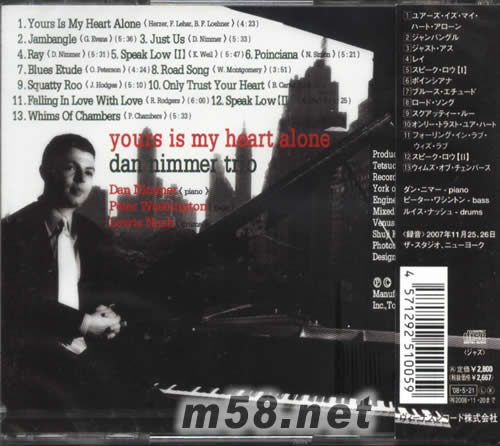 真情感覺(HIFI爵士鋼琴三重奏日本版)(m58.net) 爵士鋼琴巨星dan nimmer以三重奏演繹多首精彩作品,輕松的爵士琴韻流露出真情感覺."speak low"兩個版本兩種不同的心情不同感受.日本venus遠赴紐約頂級錄制,通透的音色如在目前.