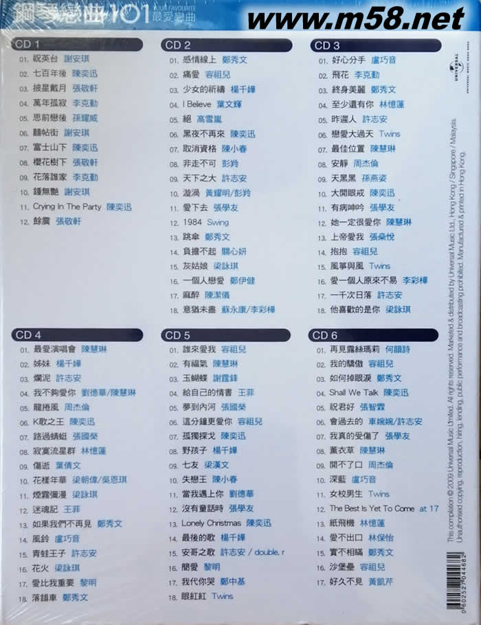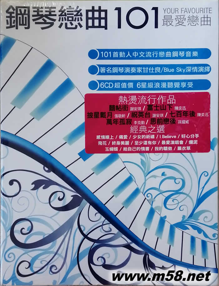 鋼琴戀曲101套裝(m58.net) 101首動人中文流行戀曲鋼琴音樂 著名鋼琴演奏家甘仕良/Blue Sky深情演繹 6CD超值價 6星級浪漫聽覺享受 熱浪流行作品 喜貼街 謝安琪/富士山下 陳奕迅/披星戴月 張敬軒/祝英臺 謝安琪/七百年后 陳奕迅 萬年孤獨 李克勤/思前想后 孫耀威 經典之選 感情線上/痛愛/少女的祈禱/I Believe/好心分手 飛花/終身美麗/至少還有你/最愛演唱會/爛泥 玉蝴蝶/給自己的情書/我的驕傲/薰衣草