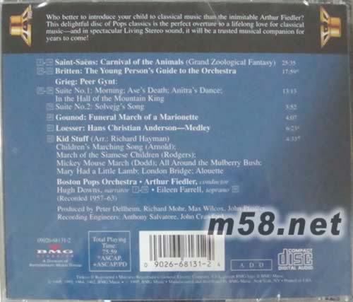 1-14 saint-saens:carnival of the animals(grand zoological fantasy) 15-34 britten:the young person's guide to the orchestra Grieg:peer gynt 35-38 suite no.1:mornign;ase's death:anitra's dance: in the hall of the mountain king 39 suite no.2: solvejg's song 40 gornod:funeral march of a marionette 41 loesser:hans christian anderson--medley 42 kid stuff(arr:richard hayman) children's marching song(arnold); marc of the siamese children(rodgers); mickey mouse march(dodd);all around the mullberrybush; mary had a little lamb;london bridge:alouette BOSTON POPS ORCHESTRA.ARTHUR FIEDLER:conductor hug downs,narrator 1-34.eileen,farrell,soprano (recorded 1957-63)