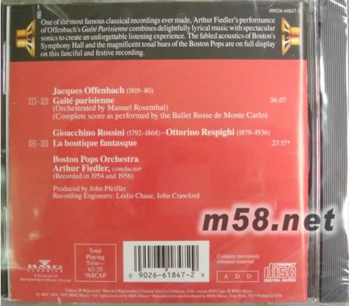 快樂的巴黎人OFFENBACH GAITE PARISIENNE(LIVING STEREO 逼真立體聲系列)(m58.net) 美國RCA公司。這個公司的最初成名作當數立體聲草創之初的錄音《歡樂的巴黎人》、《萊納之音》等。這些唱片演繹精湛,其它一系列LIVING STEREO的都首先以音效見稱。LIVING STEREO的錄音鮮活而又生動,樂器質感活靈活現,柔媚的弦樂尤其受人稱道。RCA的錄音師喜歡充分展現樂器的個性。