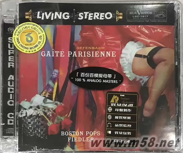 快樂的巴黎人GAITE PARISIENNE (Living Stereo 立體聲名盤 SACD )(m58.net) FIEDLER指揮 本片為RCA唱片公司最著名的Living Stereo系列中的十大名盤之一,于1954年錄制,當時是以LP的模式出售,在1993年使用ADD方式制作成了CD。經典的LP加以數碼技術改造后,唱片保持了LP豐潤的質感與流暢的音樂原味,而在解析力、音色、空氣感上又有明顯的提高。 奧芬巴赫(Offenbach)的作品比較通俗易懂,也是一位相當高產的作曲家,《快樂的巴黎人》(Gaite parisienne)就是其中作品之一。他一生創作了90部輕歌劇,以喜劇居多,風格晶瑩可愛、含意詼諧,像《霍夫曼的故事》、《地獄中的奧菲斯》和《美麗的海倫》等作品現在仍然頻繁上演于世界各大歌劇舞臺。 《快樂的巴黎人》全劇由24個小段組成,包括波爾卡、華爾茲、船歌、進行曲和康康舞曲等形式,全劇始終保持著澎湃的氣勢,在46分鐘內一氣呵成,絕無冷場。費德勒極其富有熱情和控制力的指揮藝術使每一個音符都有閃耀著奪目的光澤,波士頓通俗管弦樂團豐富的弦樂色彩、打擊樂厚重的能量感和管樂澎湃的氣勢,讓樂迷瘋狂。那拳拳到肉、充滿勁道的樂聲,從第一段就開始考驗你音響的低頻結實度,那種低頻不是過量而無法控制的龐然大物,而是精壯扎實并恰到好處的心跳脈動。難怪發燒友們都有把它作為考驗音響系統的范本!作為樂迷和音響發燒友的你又怎能錯過!