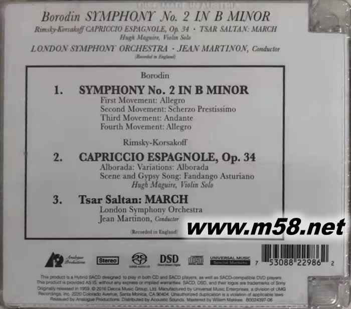 鮑羅丁 第2交響曲,里姆斯基 西班牙隨想曲 BRODIN CAPRICCIO (Living Stereo 立體聲名盤 SACD )(m58.net) 馬蒂農(nóng)<鮑羅丁:第2交響曲>SACD,馬蒂農(nóng)是一位技藝超群,格調(diào)高雅的指揮家。馬蒂農(nóng)與倫敦交響樂團(tuán)錄制了許多經(jīng)典唱片,此張中還有里姆斯基.科薩科夫:西班牙隨想曲、薩旦王的故事。