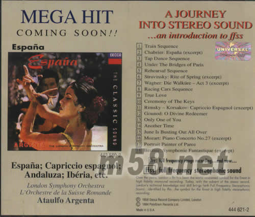 立體聲的旅程A JOURNEY INTO STEREO SOUND 火車頭(m58.net) 這張被發(fā)燒友俗稱為「火車頭」于1958年出版的唱片,嚴(yán)格說起來并不能歸類于音樂唱片的范疇,但它的確是DECCA唱片公司最珍貴的老寶貝之一。當(dāng)年「全頻段立體聲」(ffss)的推出,尼伯龍根指環(huán)全集錄音成功轟動全球以后,DECCA之聲引領(lǐng)風(fēng)騷數(shù)十年,可說是錄音史上最令人稱道的典范。 「全頻段立體聲的奇跡」這張專輯,在出版當(dāng)年原是為了推介甫問世的立體聲錄音,卻因片中收錄多段特殊音效如火車、賽車及踢踏舞聲收錄的栩栩如生及安塞美、蕭提、巴克豪斯等多位大師名演的精彩片段而轟動一時(shí)。 在目前已進(jìn)入二十一世紀(jì),早已是數(shù)字科技掛帥的今天,本片雖是1958年的老錄音,距離目前有近五十年的時(shí)光,但本片的優(yōu)異錄音,還是可以躋身當(dāng)今任何發(fā)燒片之林,而且從頭到尾沒有冷場。推薦這一張CD,不但是因?yàn)橐粜Ы艹鲋剩碇祟愪浺羰飞显诹Ⅲw聲初期竟有如斯驚人成就,更是一段錄音史上最彌足珍貴的歷史。在本專輯二手LP版價(jià)炒得半天高的令天,CD版的再度發(fā)行,對買不到原始LP的發(fā)燒友實(shí)是德政也。 身為古典迷、發(fā)燒片迷豈可沒有這一張「發(fā)燒片、DEMO片、示范片之元祖」的專輯。 這張唱片的封面是一輛急馳而來的火車頭,故通稱“火車頭”,該片只有30分鐘多一點(diǎn),時(shí)間不長,但曲目動聽,選擇了DECCA的精彩錄音片段。曲目之間有關(guān)于立體聲知識的英文講解。另外還有一些音效片段,如火車進(jìn)站,士兵換崗,賽車飛馳等。聽完這張唱片,相信你會了解DECCA錄音的“水簾式音響”是怎么一回事了。