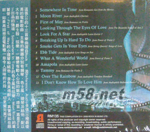 MOST BEAUTIFUL SONGS FROM THE MOVIES 至美電影歌曲經典(m58.net) 發燒的電影歌曲錄音 色優美醉人真實得如在眼前 三首樂曲分別選自巖里最優美的電影歌曲在多張光碟 奏樂器分別有鋼琴,色士風,提琴及結他 以大牛筋,爵士鼓,弦樂....一聽便有動人心弦的魅力 “時光倒流七十年”的色士風和弦樂,“月亮河”的單簧管,“五月第一”的小提琴和結他,音 美得醉人,真實得如在眼前