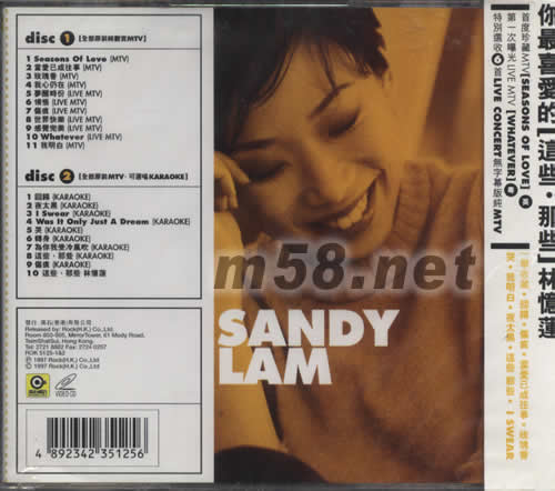 DISC1 1.SEASINS OF LOVE(MTV) 2.當(dāng)愛已成往事(MTV) 3.玫瑰香(MTV) 4.我心仍在(MTV) 5.蘿醒時分(LIVE MTV) 6.領(lǐng)悟((LIVE MTV) 7.傷痕(LIVE MTV) 8.世界快樂(LIVE MTV) 9.感覺完美(LIVE MTV) 10.WHATEVER(LIVE MTV) 11.我明白(MTV) DISC2 1.回歸(KARAOKE) 2.夜太黑(KARAOKE) 3.I SWEAR (KARAOKE) 4.WAS IT ONLY JUST A DREAM(KARAOKE) 5.哭(KARAOKE) 6.轉(zhuǎn)身(KARAOKE) 7.為你我愛冷風(fēng)吹(KARAOKE) 8.這些 那些(KARAOKE) 9.傷痕(KARAOKE) 10.這些 那些 林億蓮