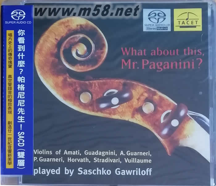 七把名琴WHAT ABOUT THIS Mr. PAGANINI ?你看到什么?帕格尼尼先生SACD(m58.net) 帕格尼尼不但是曠世無雙的小提琴奇才,他還收藏了廿多把義大利克里蒙納的名琴,其中最深愛的瓜納里名琴被暱稱為「加農砲」,成為一段傳奇。如果帕格尼尼有知,看到本片從世界各地所蒐集到七把珍貴小提琴,只怕會從地底跳了出來。這些小提琴包括一把阿瑪悌、一把瓜達尼尼、兩把瓜納里、一把史特拉第瓦里以及其他現代名師的製作。在德國科隆的交響樂廳中,利用這些名琴演奏了巴哈、帕格尼泥、德佛札克、克萊斯勒、魏本等人的弦樂作品。錄音當然還是以 1949 年的 Neumann M49 真空管麥克風進行,那價值連城的演出,你看到了嗎?
