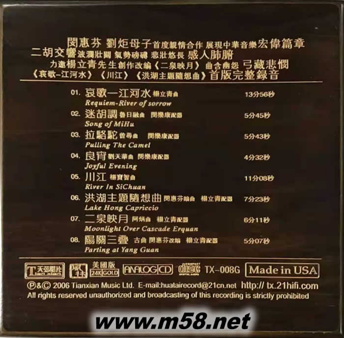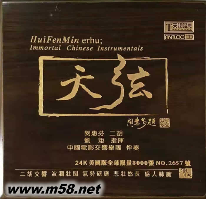 天弦 金碟(m58.net) 盡管許多發燒友都收有不止一張閔惠芬的二胡獨奏CD專輯,但近日問世的這張由她本人題寫碟名的《天弦》,仍值得第一時間擁有———這既是二胡與交響樂的合作,也是閔惠芬與兒子劉炬首度親情攜手的結晶。 二胡是典型的中國民族樂器,交響樂隊乃十足的洋樂,洋為中用,兩相交融,是二胡大師閔惠芬在演奏藝術上的一次創舉性探索。《天弦》全碟共收曲目八首,既有根據東北 民間笙管曲以協奏曲形式創編的《哀歌—江河水》,也有將二胡經典曲目重新編配的《二泉映月》、《良宵》,還有分別用古曲、現代歌劇、陜西民間小戲素材改編的《陽關三迭》、《洪湖主題隨想曲》和《迷胡調》以及原創性作品《川江》等。題材多樣,風格各異。 在這張專輯中,閔惠芬的演奏爐火純青、出神入化,情感氣勢與神韻合而為一,一弓一音都關情。而中央芭蕾舞團常任指揮劉炬執棒中國電影交響樂團的伴奏,以百多號人馬的交響樂隊在音響配置上營造出豐富性和多維性,拓展了二胡的音樂表達空間。值得一提的是,此碟還運用了XRCD24(超解析力24比特)的技術進行錄制,聲音通透均衡空氣感強,層次分明聲場深后,音樂味濃,夠“發燒”。