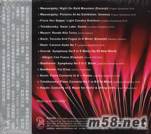 1.Mussorgsky:night on bald mountain(excerpt) prague symphony orch. 2.Mussorgsky:pictureatanexhibition:gnomus prague symphony orch 3.Franz von suppe:light cavalry overture ljubljana symphony orch 4.Tchaikovsky:swan lake:scene ljubljana symphony orch 5.Mozart:rondo alla turca sylvia caova 6.Bach:toccata and fugue in D minor(excerpt) klemens schnorr 7.Bizet:carmen suite N0.1 ljubljana sympnony orch. 8.Dvorak:symphony No.9 in E MINOR,OP 95 new world-allegro con fuoco(excerpt) slovak phil orch. 9.Beethoven:symphony No.5 in C Minor ljubljana symphony orch. 10.Beethoven :fur elise Valery lyoyd-watts 11.Ravel:piano concerto in G-Presto ljubljana symphony orch. 12.Tchaikovsky:piano concerto No.1 in B-flat minor ljubljana symphony orch. 13.Haydn:concerto in C major for violin & string orch.lsrael philharnonic