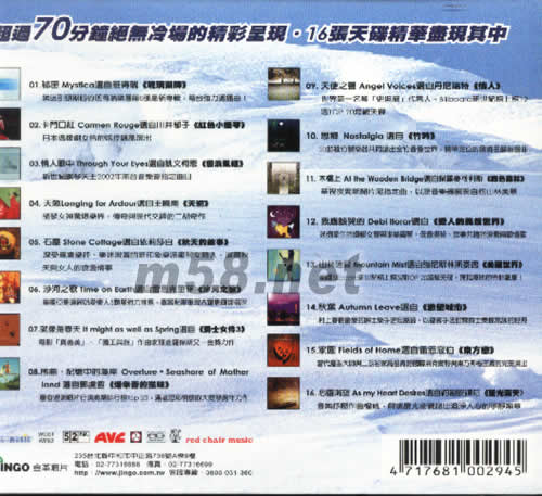 1、stica 秘密/選自班得瑞《玻璃湖畔》樂迷引頸期盼的班得瑞樂團第張最新專輯,電臺強力選取播曲 2、rmen Rouge 卡門口紅/選自川井郁子《紅色小提琴》日本偶像劇女令的炫火技飆風演出 3、rough Your Eyes 情人眼中/THROUGH YOUR EYES選取自凱文柯恩《云淡風輕》新世紀鋼琴天王2002年來臺音樂會指定曲目 4、天欲LONGING FOR ARDOUR/選自王曉南《天欲》胡琴女神驚爆樂界,傳奇與現代交鋒的二胡奇作 5、Stone Cottage 石屋/選自依莉莎白《秋天的故事》深受專業樂評、樂迷邀賞的新印象樂派鋼琴女詩人,道盡秋天與女人的浪漫情事 6、Time on Earth 沙河之歌/選自雷恩克里菲《沙河之歌》美國亞馬遜網站愛樂人顆星強力推薦,豐富配器重現古羅馬輝煌盛世 7、It might as well as Spring 就像是春天/選自《爵士女伶3》電影《真善美》《國王與我》作曲家理查羅杰斯又一金獎力作 8、Overture˙Seashore of Motherland 序曲‧記憶中的海岸/OVERTURE·SEASHORE OF MOTHER LAND 選自郭虔哲《爆米得的滋味》屢登連鎖唱片行演奏百行榜TOP 20,滿溢思鄉情懷的大提琴跨年力作 9、Angel Voices 天使之聲/選自丹尼瑞特《情人》世界第一名琴[史坦威]代言人,BILLBOARD新世紀榜上榜12周TOP 20超級天碟 10、Nostalgia 思鄉選自/選自《竹吟》20余種竹制樂器共同譜出全竹音像世界,精準定位的發燒名盤首選取曲 11、At the Wooden Bridge 木橋上/選自保羅麥可利斯,《綠色森林》華視夜間新聞片尾指定曲,以原音樂器展現自然山林美景 12、Debi llorar 我應該哭的/DEBL LLORAR選取自《愛人的異想世界》迷倒眾生的慵懶女聲與唯美鋼琴、低音提琴、鼓樂共譜的浪漫南歐情歌 13、Mountain Mist 山林迷霧/選自強尼斯林斯泰德《美麗世界》美國BILLBOARD新世紀榜上榜3周TOP20超極天碟,無我境地的吉他飆奏! 14、Autumn Leave 秋葉/選自《欲望城市》最愛的爵士樂手史坦蓋茲,以都會手法詮釋爵士樂最雋永的經典 15、Fields of Home 家園 /選自雷恩寇伯《東方戀》當代魔向大師與二胡名字高韶青跨國聯演克爾特與東方神秘主義的完美演出 16、As my Heart Desires 心靈渴望/選自約翰安鐸尼,《星光滿天》音樂抒壓作曲權威,解讀星光密碼譜出澄凈人心的寧靜樂章