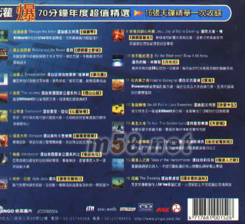 1、走過(guò)綠意Through the Arbor選自凱文柯恩《綠鋼琴》 BILLBOARD新世紀(jì)榜TOP10蟬聯(lián)26周,今年最暢銷的超強(qiáng)猛片! 2、美女與野獸 Beauty and the Beast選自《娜娜爵士影城》 希臘國(guó)寶天后娜娜與爵士天王享利。貝拉方提,千載難逢同臺(tái)竟選版本 3、追夢(mèng)人 Dreamcatcher選自班得瑞樂(lè)團(tuán)第七張專輯《夢(mèng)花園》 屢登新世紀(jì)銷售冠軍樂(lè)團(tuán),挑戰(zhàn)挪威[秘密花園]銷售百萬(wàn)名曲 4、旅程The Journey選自美國(guó)國(guó)家公園系列之《煙山山脈》 盤隊(duì)BILLBOARD新世紀(jì)榜霸王碟,超爆棚的綠音典苑! 5、古奇連Cuchulainn選自雷恩。寇伯《心靈秘境》 李安、吳宇森欽點(diǎn)的當(dāng)代魔笛大師,大格局史詩(shī)音樂(lè)直島克雨特音樂(lè)最核心 6、傾盆大雨 Monsoon選自貝利卡登樂(lè)團(tuán)《顛覆愛爾蘭》 驚爆全歐,叛逆附身的愛爾蘭樂(lè)團(tuán),來(lái)臺(tái)演出指定演奏曲 7、鳥瞰 Introduction選自美國(guó)國(guó)家公園系列之《優(yōu)勝美地》 亞馬遜綱站最佳新世紀(jì)鋼琴專輯。專業(yè)樂(lè)評(píng)、音響專家人手一張的超級(jí)天碟 8、來(lái)吧,亞諾Ajde Jano選自《愛戀克爾特2》 當(dāng)代克爾特曠世名曲,全球數(shù)十種翻唱皆望塵莫及的唯一原唱版本 9、你是我誠(chéng)心所愿Jesu, Joy of Man’s Desiring選自大街。楊 《親親圣誕夜》華視夜間新聞片尾指定曲,受邀白宮演奏首席長(zhǎng)笛家的跨世紀(jì)感恩紀(jì)念專輯 10、吹不散的思念 So the Wind Won’t Blow it All Away選自約翰。米爵斯《月光河》 澳洲吉他大師30年功力一次展現(xiàn),探究新世紀(jì)音樂(lè)最澄靜的精隨本味 11、杜內(nèi)嘉之路Road to Doneghal選自尼吉霍頓《云海》 DISCOVERY頻道專屬配樂(lè)大師,融合全球五大洲音樂(lè)元素,呈現(xiàn)大瞻精彩的聽覺冒險(xiǎn) 12、熟能無(wú)情We All Fall in Love Sometime選自凱文柯恩《珍愛今生》凱文柯恩又一榮登BILLBOARD排行榜,全球樂(lè)迷引進(jìn)期盼的超強(qiáng)靚碟 13、黃金大地Tir Aur- The Golden Land選自圣恩樂(lè)團(tuán)《天使魂》華麗多層次美聲吟唱,重現(xiàn)失傳的神秘克爾古語(yǔ) 14、新天碟樂(lè)團(tuán)Cinema Paradiso選自安納斯塔西《新世紀(jì)電影院》新世紀(jì)九人室內(nèi)樂(lè)團(tuán),激發(fā)金獎(jiǎng)電影主題曲最璀爛的光芒 15、擺渡人之歌 Tales of the Harbormaster選自依莉莎白《擺渡人之歌》重量級(jí)鋼琴女詩(shī)人,本世紀(jì)最能讓你掏心傾聽的鋼琴獨(dú)白專輯 16、祝福 The Blessing選自郭虔哲《爆米香的滋味》 馬友友專輯制作人ED YEN專屬打造,大提琴史上不可思義的柔情釋放