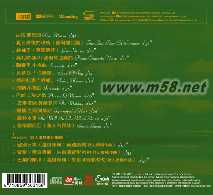 民謠 嚴(yán)選薰衣草典藏專(zhuān)輯 New XRCD+SHMCD(m58.net) 大師級(jí)評(píng)鑒賞識(shí)版 發(fā)燒級(jí)高傳真錄音質(zhì)量,從拾音、后制到壓片均全面性的低失真要求,樂(lè)器演奏細(xì)節(jié)完整保存,留住了音樂(lè)中的靈魂,此碟是要求高品味不容錯(cuò)過(guò)的極高音樂(lè)性的佳作。 它是所有發(fā)燒友夢(mèng)寐以求的佳作,也是不發(fā)燒羣體啟發(fā)音樂(lè)心靈之窗。 Made In Japan New XRCD,對(duì)母帶素材並無(wú)特別要求。即使不是Hi-Bit.Hi-Sampling的母帶素材,只要經(jīng)過(guò)XR cording處理后便立即Up convert,再透過(guò)DAW(Digital Audio Workstation)所輸出的數(shù)位資料,經(jīng)由JVC選定的錄音師進(jìn)行母帶后製工程。 接著,母帶后製工程所完成之Hi-Bit.Hi-Sampling的High-Resolution素材,再透過(guò)HR cutting進(jìn)行Direct cutting(刻盤(pán))。然后,將大幅提升的高透明度、高解析素材,以SHM-CD進(jìn)行壓片。 經(jīng)過(guò)全部的后製工程,對(duì)原母帶音質(zhì)細(xì)節(jié)部份的專(zhuān)業(yè)處理,重視如同錄音時(shí)的相同品質(zhì)。讓聽(tīng)眾能夠盡情享受到由歌手、製作人、錄音師們所想要呈現(xiàn)的音樂(lè)。 New XRCD能夠在所有的CD Player播放。 SHM-CD (Super High Material CD) 的原料不同於目前的CD,採(cǎi)用的是與液晶面板相同的聚碳酸脂熱可塑性材質(zhì)。使其更加具有透明性及高音質(zhì)的CD。 SHM-CD的品質(zhì)特性 使用高流動(dòng)行及高轉(zhuǎn)寫(xiě)性的材料,使得CD的刻盤(pán)可以更加精密細(xì)致。 訊號(hào)特性更加優(yōu)越。 所有的CD PLAYER皆可以使用。(不挑CD PLAYER) 平衡度比一般CD更優(yōu)良。 堅(jiān)持以高品質(zhì)為優(yōu)先的生產(chǎn)流程。 SHM-CD的生產(chǎn)堅(jiān)持 1. 採(cǎi)用JVC獨(dú)自的一體成型工法,高流動(dòng)性、高轉(zhuǎn)寫(xiě)度的新器材應(yīng)用於CD。 2. 採(cǎi)用最新改良再加上JVC原創(chuàng)的高精細(xì)度的模板。 3. 使用全新設(shè)備的生產(chǎn)線(xiàn)。 SHM-CD的音質(zhì) 實(shí)現(xiàn)透明感的音質(zhì)。 解析度大幅進(jìn)步。 音質(zhì)的平衡度更優(yōu)良。 減少偏音感,解除一般CD低音域的不足現(xiàn)象。 大師級(jí)評(píng)鑑賞識(shí)版 **發(fā)燒級(jí)高傳真錄音品質(zhì),從拾音、后製到壓片均全面性的低失真要求,樂(lè)器演奏細(xì)節(jié)完整保存,留住了音樂(lè)中的靈魂,此碟是要求高品味不容錯(cuò)過(guò)的極高音樂(lè)性的佳作。 你準(zhǔn)備好了嗎?一整片紫色的花草香,就在身心鬆弛的一刻,讓你聽(tīng)見(jiàn)。 你問(wèn)我:『聽(tīng)見(jiàn)花草香的芬芳嗎?』站在綿延的薰衣草田里,清新的青草香簇?fù)碇鴥?yōu)雅的氣習(xí),我不禁深深地吸了一口氣。『是啊!音符在紫色的花束間跳躍著,輕柔的旋律拂過(guò)耳際,彷彿是薰衣草飄逸的裙襬,充滿(mǎn)幸福的香氣撲鼻,空氣開(kāi)始清凈透明。』