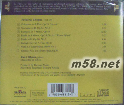 MY FAVORITE CHOPIN(m58.net) (Van Cliburn,1934-),美國(guó)鋼琴家。自幼學(xué)琴,1947年在德克薩斯州獲青年鋼琴比賽獎(jiǎng)。1948年獲國(guó)際音樂節(jié)獎(jiǎng)并在卡內(nèi)基大廳公演。1951年獲朱利亞特音樂學(xué)院的協(xié)奏曲比賽獎(jiǎng),以優(yōu)異成績(jī)畢業(yè)于該校。同年還獲達(dá)拉斯的戴雷獎(jiǎng)和科修斯柯基金會(huì)的肖邦獎(jiǎng);1954年獲美國(guó)為他舉行了凱旋儀式。他現(xiàn)在美國(guó)經(jīng)常演出,技巧精湛,音色豐富多變,表現(xiàn)幅度廣而富于分寸感。甚至曾經(jīng)有人由于聽了他彈的曲子難以入睡,足見克萊本技藝精湛。