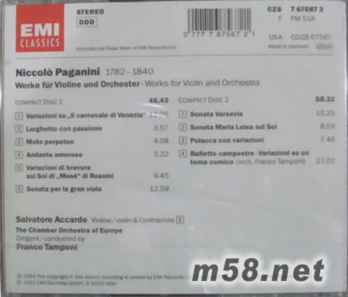 帕格尼尼小提琴(阿卡多與歐洲室內(nèi)樂團演奏)綠色封面專輯背面圖片