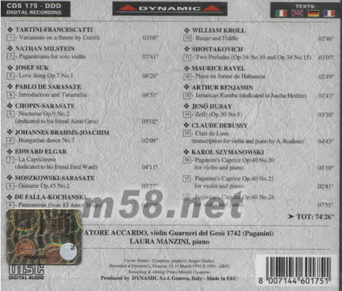 TARTINI-FRANCESCATTI 1 Variations on a theme by Corelli NATHAN MILSTEIN 2 Paganiniana for solo violin JOSEF SUK 3 Love Song Op.7 No.1 PABLO DE SARASATE 4 Introduction and Tarantella CHOPIN-SARASATE 5 Nocturne No. 2 Op. 9 (dedicated to his friend Aime Gros) JOHANNES BRAHMS-JOACHIM 6 Hungarian Dance No. 7 EDWARD ELGAR 7 La Capriceuse MOSZKOWSKI-SARASATE 8 Guitarre No. 2 Op. 45 DE FALLA-KOCHANSKI 9 Pantomime(from EL Amor Brujo) WILLIAM KROLL 10 Banjo and Fiddle SHOSTAKOVICH 11 Two preludes MAURICE RAVEL 12 Piece en forme de Habanera ARTHUR BENJAMIN 13 Jamaican Rumba (dedicated to Jascha Heifetz) JENO HUBAY 14 Zefir (Op.30 No.5) CLAUDE DEBUSSY 15 Clair de Lune (transcription for violin and piano by A.Roelens) KAROL SZYMANOWSKI 16 Paganini's Caprice Op,40 No.20 for violin and piano 17 Paganini's Caprice Op.40 No.21 for violin and piano 18 Paganini's Caprice Op.40 No.24 for violin and piano