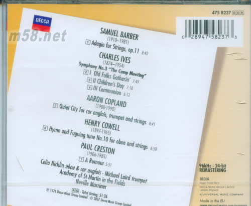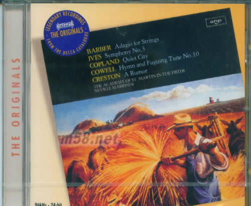 BARBER:ADAGIO FOR STRINGS 巴伯:柔板/馬連納(m58.net) 巴伯這首弦樂慢板是由他的弦樂四重奏OP.11的慢板樂章改編而成。馬里納和圣馬丁的演奏具有強烈的明暗對比及說服力,且錄音亦相當(dāng)出色聲音豐潤,值得推薦。