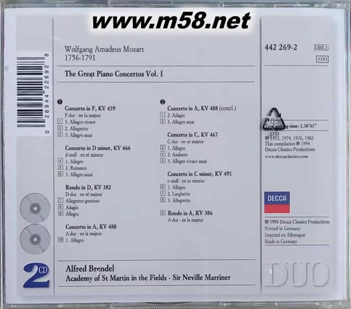 MOZART 莫扎特鋼琴協奏曲 MOZART THE GREAT PIANO CONCERTOS NOS.19,20,21,23,24 白色封面雙CD專輯背面圖片