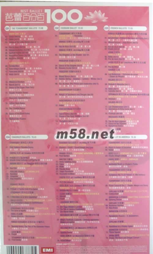 芭蕾百分百套裝Best Ballet 100(m58.net) 全球銷量超越300萬大關[百分百]系列 芭蕾是一種優雅而輕盈的舞蹈,它是一種綜合的藝術創作,結合了音樂,舞蹈.舞臺,燈光.服裝等多方面的藝術形式.其中音樂的作用隨著芭蕾舞的發展.顯示得日益重要.自19世紀以來眾多偉大的音樂家應邀為芭蕾舞劇創作音樂.其中最為著名的有柴科夫斯機制三大芭蕾音樂[天鵝湖],[睡美人]和[胡桃夾子]等.芭蕾起源于文藝復興時期意大利.17翹尾巴傳入法國后.芭蕾舞風靡了整個國家.亦由此發展成一種正統的舞蹈并確立了一套完整的動作體系.對芭蕾舞發展做成了深遠的影響.1850年代以后.法國的芭蕾舞被帶到俄羅斯和丹麥并得到發揚光大.到了二十世紀初.俄國發展出芭蕾的新風格又被帶回西方.由佳吉列夫率領的俄羅斯和丹麥舞團在巴黎.倫敦.紐約.羅馬等各地巡回演出.并委托許多作曲家為其舞團創作.直拉催生許多二十世紀重要的作品像拉威爾的[波萊羅].[達夫尼斯與克洛埃].斯特拉文斯基的].[春之祭].[火鳥]...等等.另美國作曲家科普蘭及伯恩斯坦亦譜寫了[阿帕拉契春]和[西城故事]等作品隨著舞劇的聲名日隆.它的音樂亦被帶到全球各地.除了傳統的芭蕾舞曲外.有很多并非為芭蕾譜寫的古典音樂.也被編舞家用于;配樂.像肖邦的[仙女們].柴科夫斯基的鋼琴協奏曲.交響曲和小夜曲.埃爾加的[謎語變奏曲]...等都出現于芭蕾舞臺上.本6CD專輯100首曲目全面地典雅.華麗.優美.強烈而又支聽.芭蕾舞音按不同的派別展示于聽眾面前.