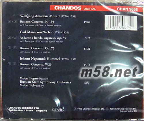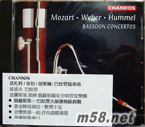 價格為估,以實到貨為準! 莫扎特/韋伯/胡麥爾:巴松管協奏曲(m58.net) 莫扎特/韋伯/胡麥爾:巴松管協奏曲 波波夫 巴管 波蘭斯基指揮 俄羅斯國家交響管弦樂團 俄羅斯第一巴松管大師發燒級名盤 黃金陣容演出,默契十足 音樂質感一流;音色溫暖通透 英國原裝進口
