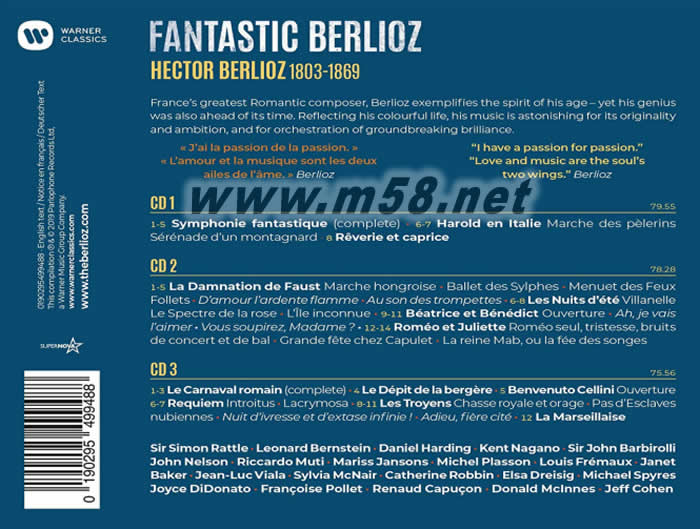 法國偉大作曲家HECTOR BERLIOZ(白遼士)逝世150周年紀念鑒聽3CD選輯(m58.net) 法國作曲家白遼士,1803年出生於里昂附近的圣昂德雷角,1869年3月8日在巴黎去世。也就是說,到了2019年,白遼士逝世正好屆滿150週年。白遼士作品的藝術價值,一直要到死后多年的二戰結束之后,才逐漸為世人所熟知。白遼士的孩提時代,並沒有受過太多的音樂教育,鋼琴也彈得不好,然而,白遼士的音樂生涯,堪稱浪漫樂派作曲家的縮影。他所彰顯的是19世紀主宰整個藝術世界的浪漫精神:強調個人的靈感與主觀性,優先於一切。他是貝多芬─浪漫樂派之父的狂熱崇拜者,也從莎士比亞、歌德、拜倫、雨果等人的文學作品當中,汲取創作養份。白遼士擅長用音樂表現他多采多姿的生活,他的情感強烈,以致於他無法安於規律的生活,他為了藝術與創作,燃燒生命。他的大部分作品都帶有自傳性質。最著名的作品《幻想交響曲》(1830年)的靈感來自於他對英國女演員哈麗特‧史密森(Harriet Smithson)的癡迷,最終修成正果。從他的作品可以感受到極富個人色彩的創作野心與原創性,比方說,他在《亡靈大彌撒》(安魂曲)當中就使用了16支定音鼓,在歌劇《特洛伊人》里用了六把豎琴。獨特的詩意與個人色彩濃烈的氛圍,是他重要作品當中最顯著的特色,特別是在史詩歌劇《特洛伊人》中,最能夠總結白遼士的音樂藝術的多樣性。